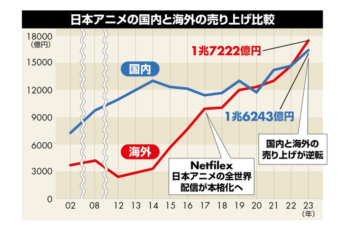 政府は2033年までにエンタメ産業の海外売上高を20兆円に拡大する目標を掲げており、アニメ市場の海外市場は既に国内市場を上回っています。