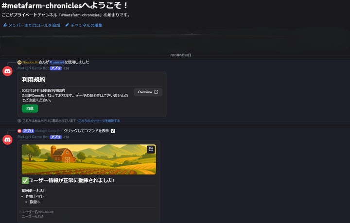 - Discord上でテキストコマンドで遊べる農業シミュレーションゲーム「MetaFarm Chronicles」のα版アーリーアクセス開始