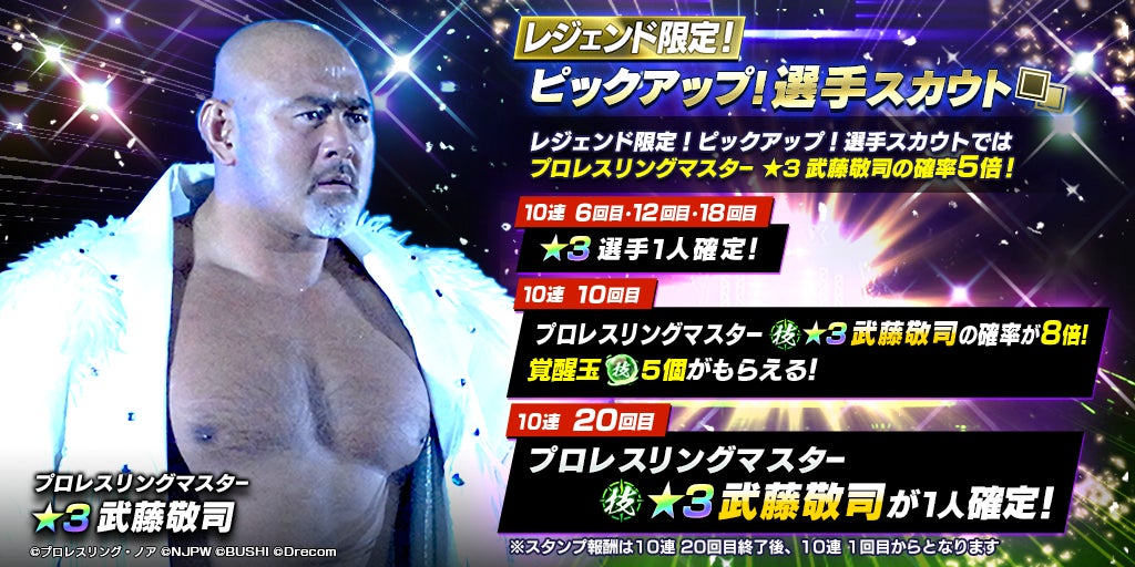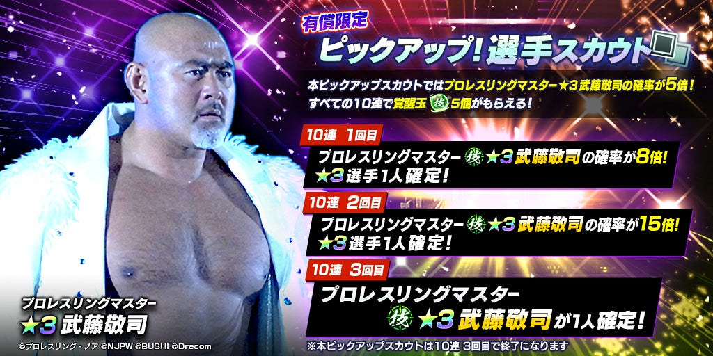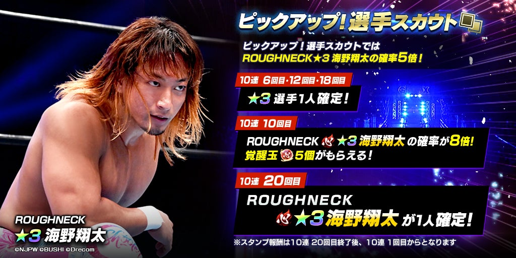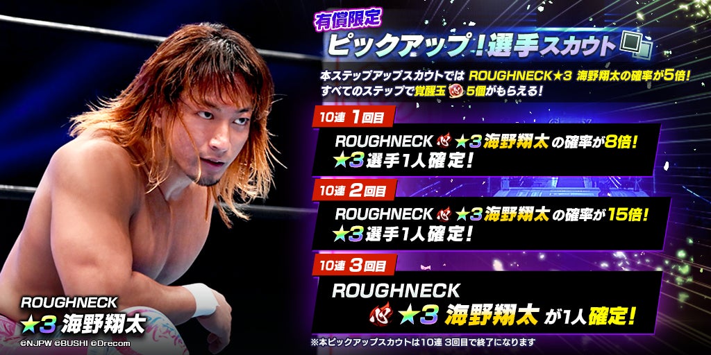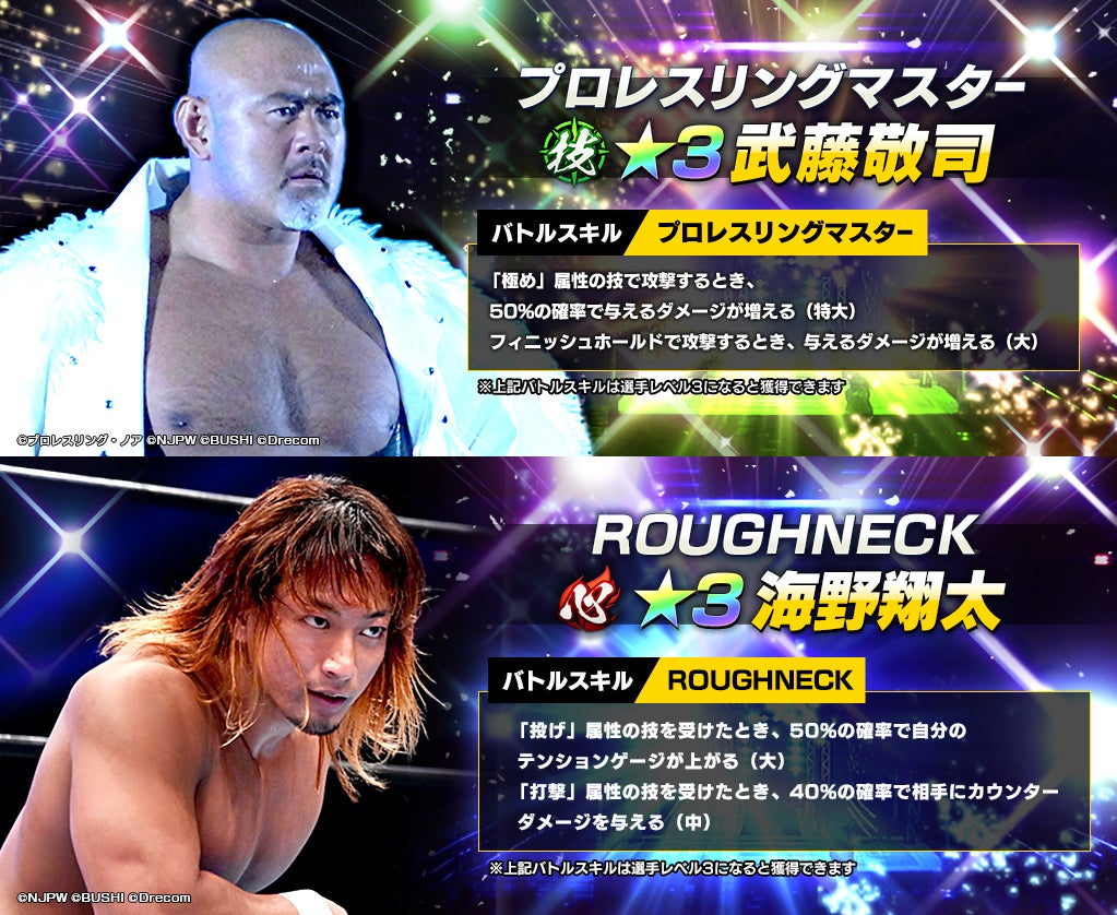 2023年7月19日のメンテナンス終了後から、★3選手「[プロレスリングマスター]武藤敬司」と「[ROUGHNECK]海野翔太」が追加され、ユーザーにはダイヤ1500個がプレゼントされました。