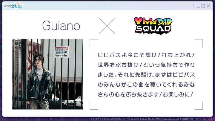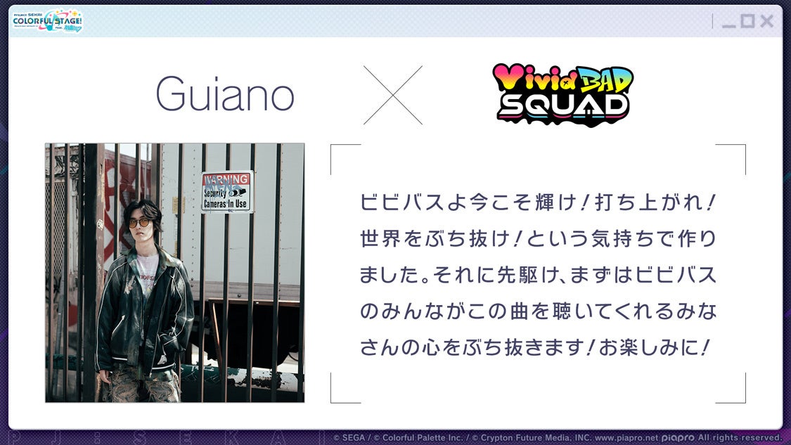 Guianoさんが「Vivid BAD SQUAD」の書き下ろし楽曲提供クリエイターとして参加決定し、リズムゲームに新曲4曲が追加されます。