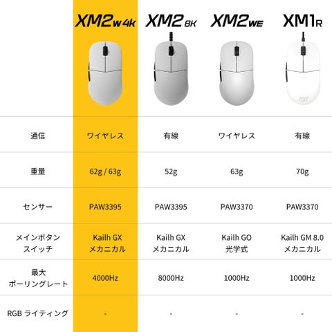 - XM2w 4Kは、最大4Kポーリングレート、低遅延のKailh GXスイッチ搭載。