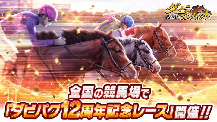 スマートフォン向け競走馬育成ゲーム『ダービーインパクト』が12周年を記念し、全国8つの競馬場で「ダビパク12周年記念レース」を開催します。