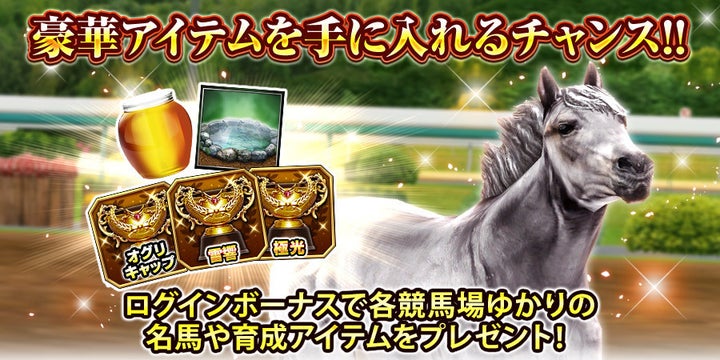 - ゲーム内では、各競馬場ゆかりの名馬をプレゼントする豪華ログインボーナスを実施。