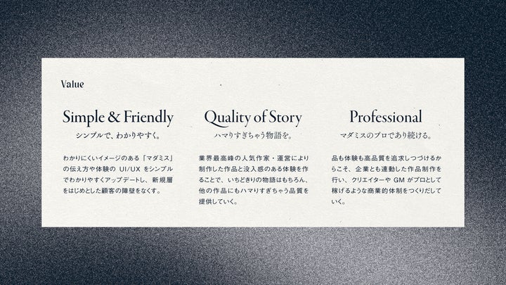 - 高品質な物語体験を提供し、マダミスをより多くの人に届けることを目指す。