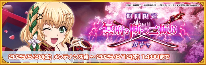 - 新闘士「【大業物なかわいげ】桂樹」が登場するガチャや、イベント限定SRキャラ「【鋭刃】呂蒙子明」を獲得するチャンス。