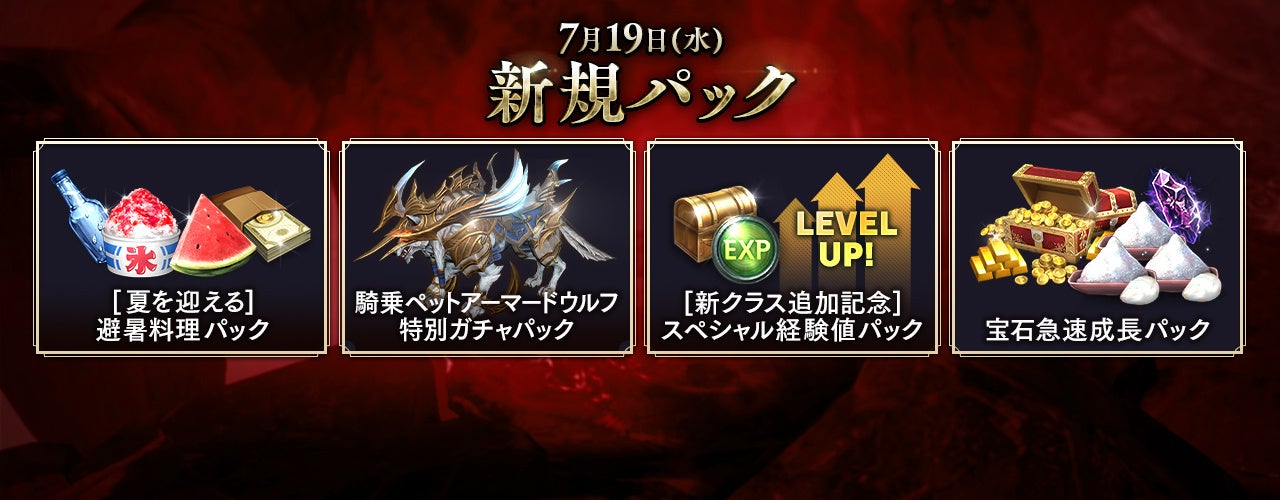 また、新しい騎乗ペット「アーマードウルフ」や記念パックも登場しており、キャラクターのレベルに合わせた経験値を獲得できるパックも追加されました。