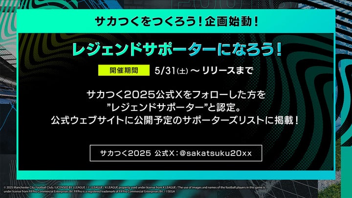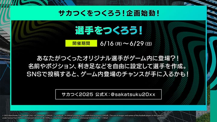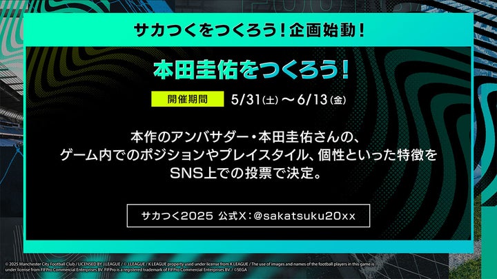 さらに、ユーザー参加型の企画「サカつくをつくろう!」がスタートし、本田圭佑選手が登場する企画や、オリジナル選手作成イベントも実施される。