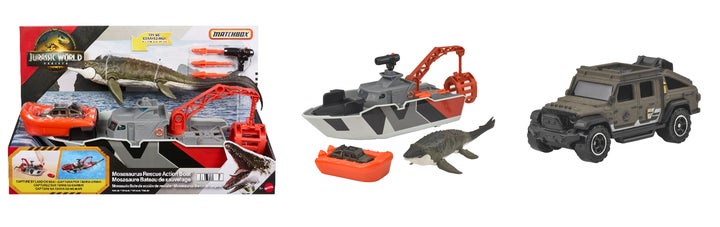 - ジュラシック・ワールド ベーシックカー、ジュラシック・ワールド/マッチボックス モササウルスを運べ!水陸両用レスキューシップ、マッチボックス ジュラシック・ワールド 5パック アソート、マッチボックス ジュラシック・ワールド トランスポーターズ アソート