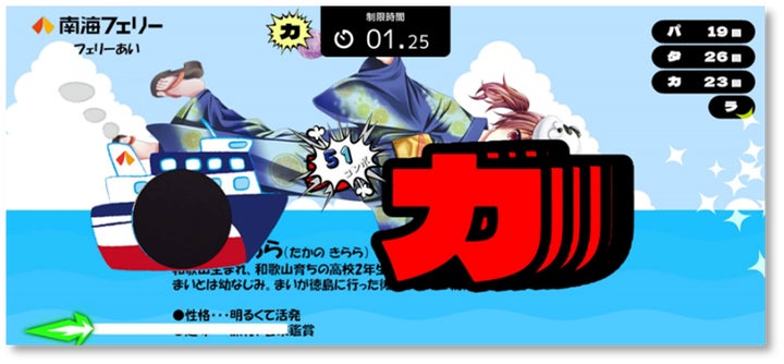 このゲームは、口腔機能トレーニング「パタカラ体操」と滑舌検査を融合した音声シューティングゲームであり、南海フェリーの公式キャラクターや船舶が登場する。