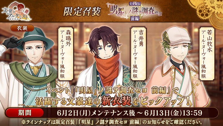 DMM GAMESは、女性向け文豪転生シミュレーションゲーム「文豪とアルケミスト」にて、イベント『文史紀伝「『明星』ノ謎ヲ調査セヨ 前編」』と限定召装『『明星』ノ謎ヲ調査セヨ 前編』を開始。