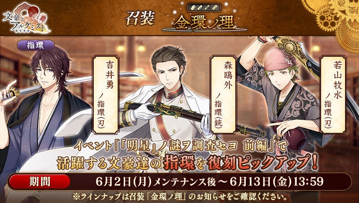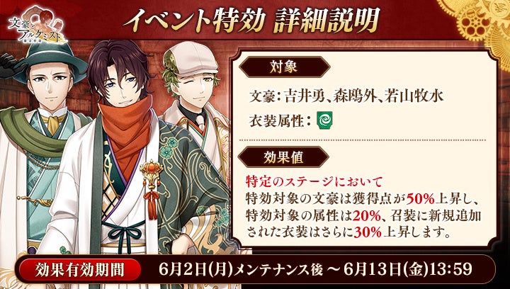 期間中は「吉井勇」「若山牧水」「森鴎外」の衣装編成で得点上昇、さらに限定召装の衣装を編成すると獲得率がアップ。
