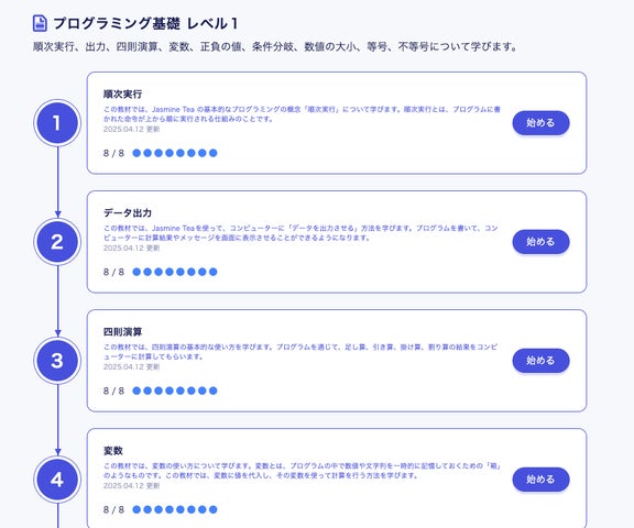Tably 株式会社が提供する初心者向けプログラミング学習サービス「Jasmine Tea」が、新機能を搭載してアップデートされました。