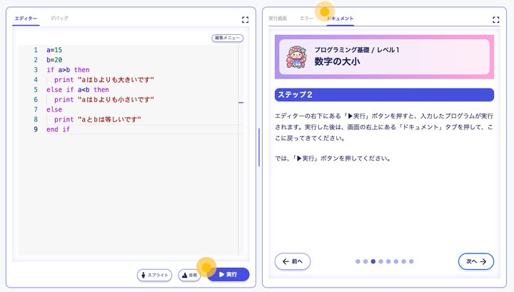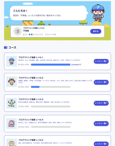コース一覧機能により学習のスタート地点が明確になり、レベル5達成でオリジナルゲーム制作が可能に。