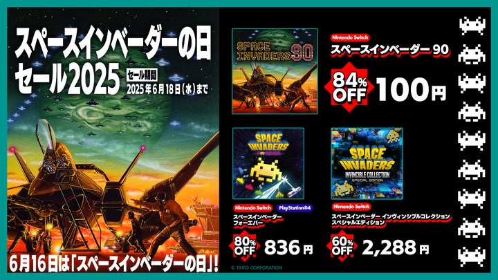 タイトーは、6月16日の「スペースインベーダーの日」を記念して、「スペースインベーダーの日セール2025」を開催する。