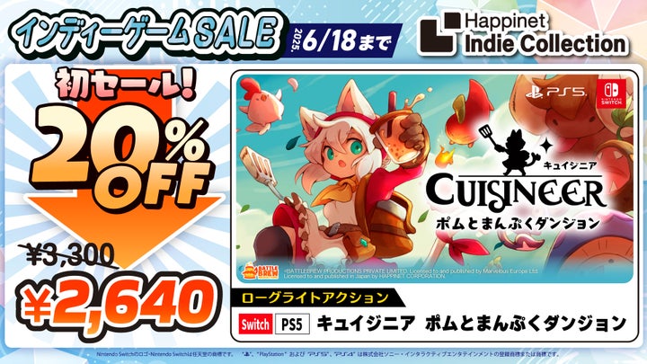 ローグライトアクションゲーム『キュイジニア ポムとまんぷくダンジョン』がダウンロード版リリース後初のセールとなり、20%OFFの2,640円で購入できる。