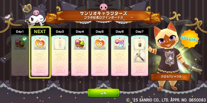 2025年6月19日まで「クロミTシャツ2」や「ハローキティTシャツ2」などを配布。