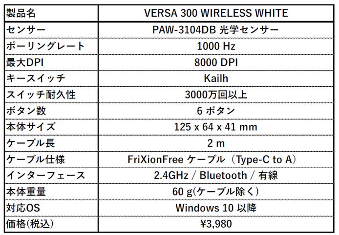 - 「VERSA 300 WIRELESS WHITE」は60g、8,000DPI、最大50時間バッテリー駆動。