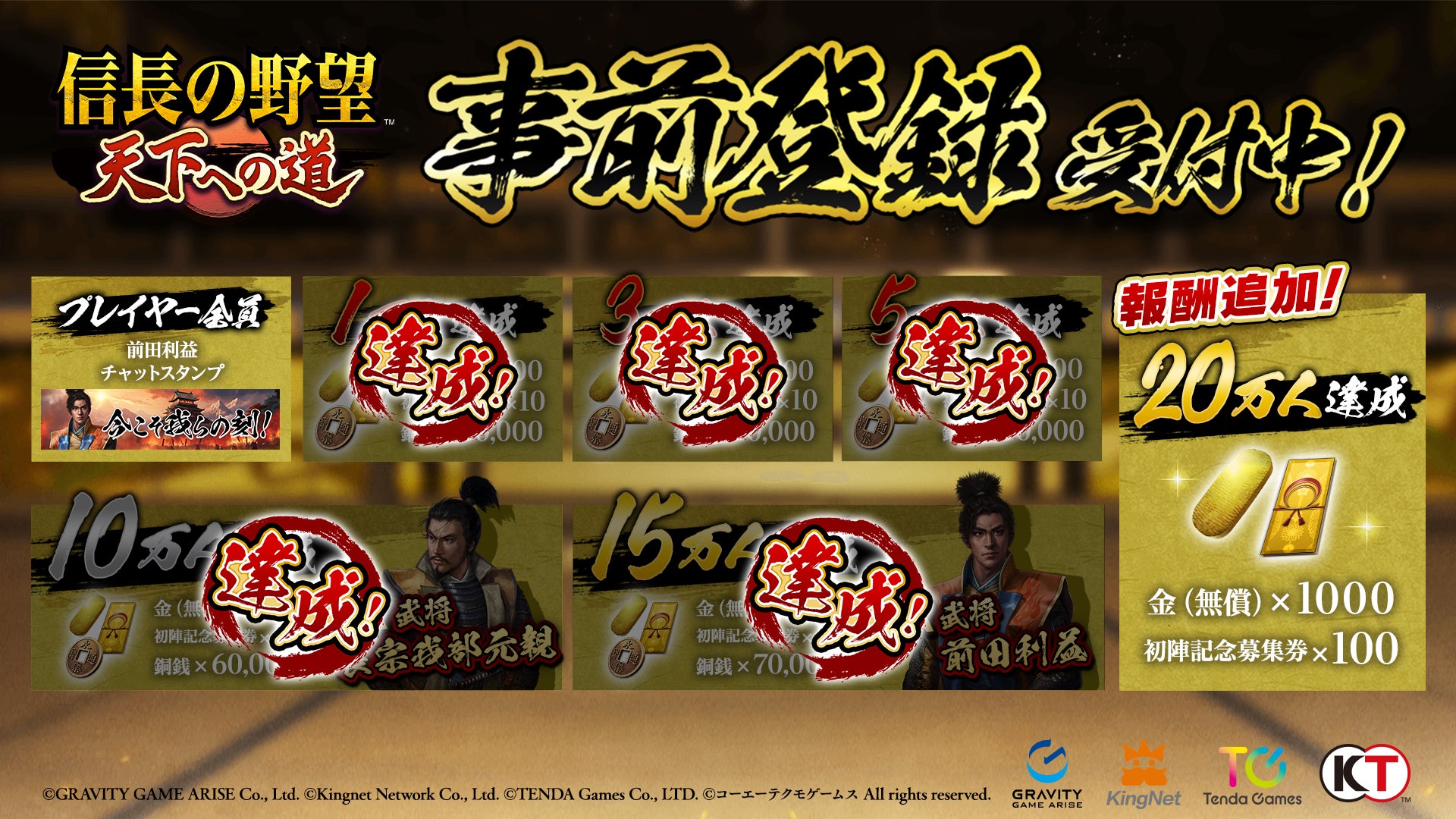 テンダゲームスが、コーエーテクモゲームスの『信長の野望・天道』の正式ライセンスを受け、グラビティゲームアライズと共同で開発するスマホゲーム『信長の野望 天下への道』の事前登録者数が15万人を突破。