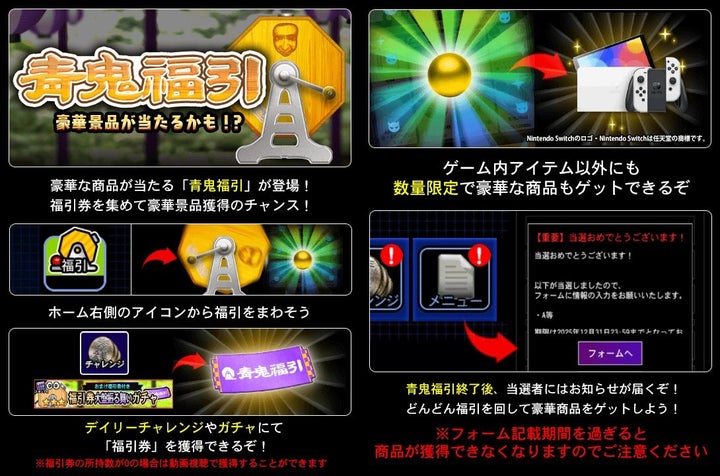 また、青銭を大量獲得できる「超青銭祭」や、最大2025連引ける「引き放題ガチャ」も開催され、青鬼じゃんけん、クイズ、ランといったイベントも実施されます。