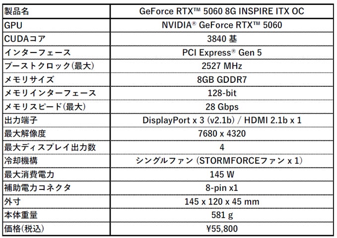 GeForce RTX™ 5060 8G INSPIRE ITX OCは、小型で取り回しの良い「STORMFORCEファン」を搭載し、ITXケースにも対応する。