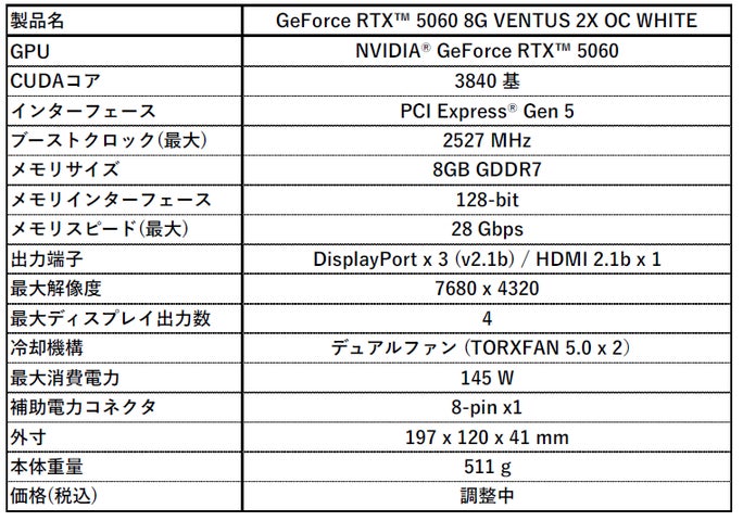 • VENTUS 2X OC WHITEは、デュアルファンと白基調デザインが特徴。