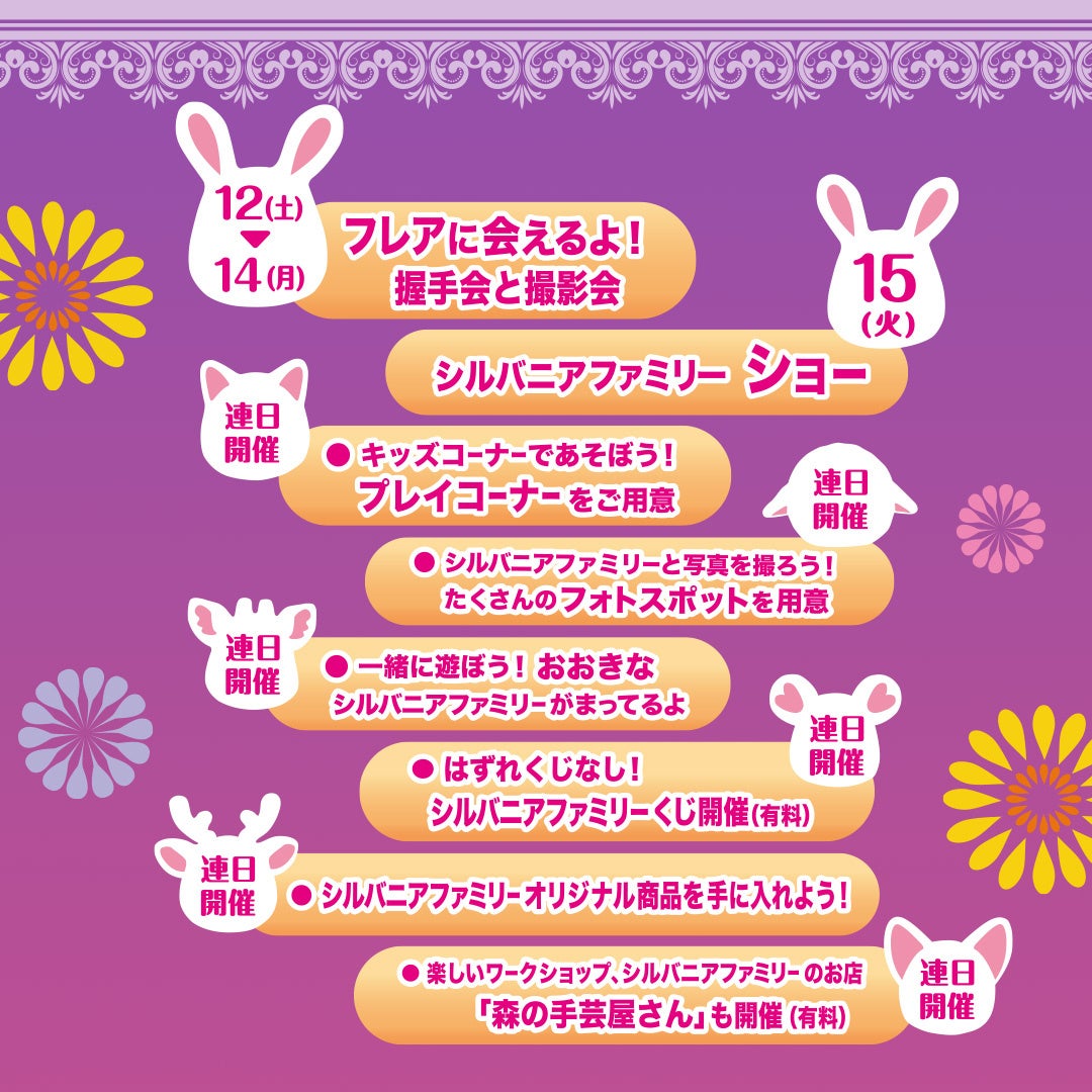 特設ブースでは、フレアとの記念撮影やシルバニアファミリーショーなどのスペシャルイベントが開催されます。
