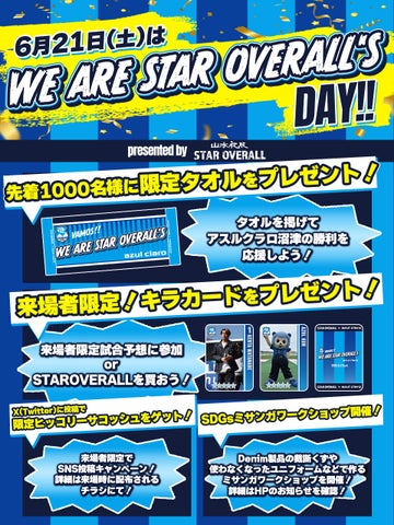- 6月21日(土)にアスルクラロ沼津のホームゲームで「WE ARE STAR OVERALL’S DAY」開催。