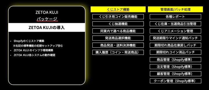 ZETOA株式会社が提供するオンラインくじソリューション「ZETOA KUJI」は、EC事業者向けに短期間で導入可能なパッケージです。