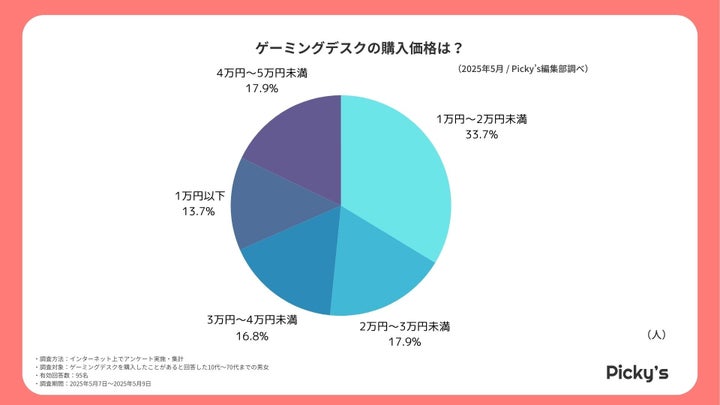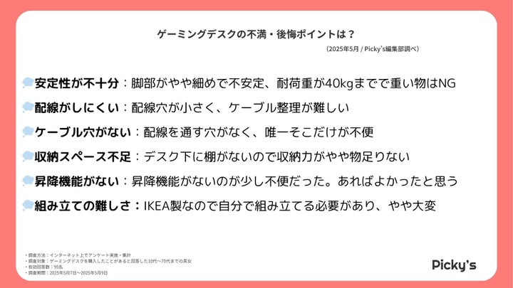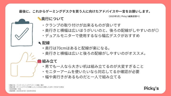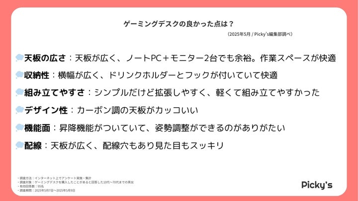 Picky’sが実施したゲーミングデスクに関するアンケート調査の結果、95人のユーザーの声から、ゲーミングデスク選びのポイントをまとめたものです。