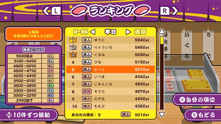 プレイヤーは寿司職人となり、注文に合わせてネタを選び、素早く正確にお寿司を握る。