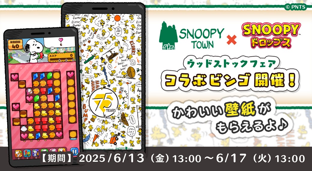 爽快パズルゲーム『スヌーピードロップス』が、全国のスヌーピータウンショップで開催される「ウッドストックフェア」とのコラボイベントを2025年6月13日から開催します。