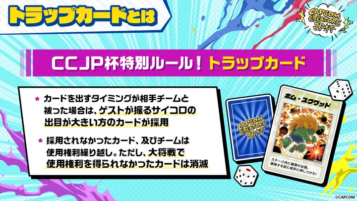 総勢85名のYouTuberが所属する「Capcom Creators JP(CCJP)」の『ストリートファイター6』を使用した公式イベントで、特別ルール「トラップカード」が採用され、大逆転の可能性も秘めている。