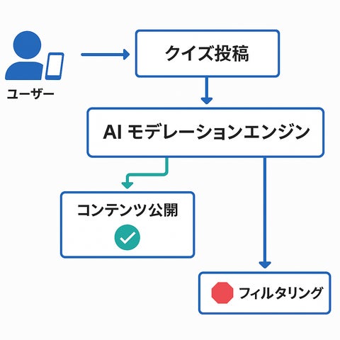 AIがクイズ内容をリアルタイムに解析し、不適切表現を検知してフィルタリング、警告、通報を行う。