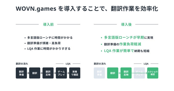 WOVN.gamesの導入により、翻訳作業の煩雑さ、翻訳品質の課題、LQAでのエラー報告の手間を解決。