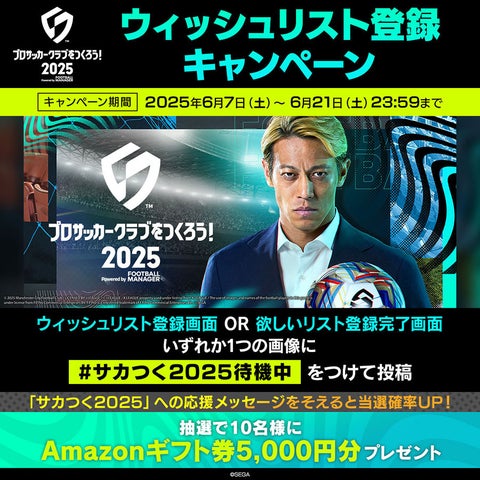 SteamまたはPlayStation™Storeでウィッシュリスト登録後、ハッシュタグ「#サカつく2025待機中」を付けてXにポストすると、抽選で10名にAmazonギフトカード(5,000円分)がプレゼントされる。