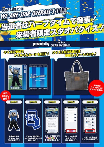 6月21日(土)のFC琉球戦を対象に、得点選手やゴール時間、スコアなどを予想し、上位者にはSTAR OVERALLグッズや選手サイン入りポスターをプレゼントする。