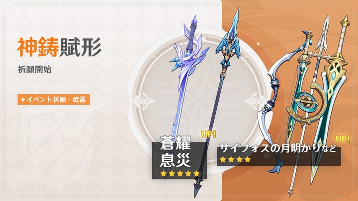 イベント祈願では「スカーク」と「申鶴」がピックアップされ、武器ガチャも開催。