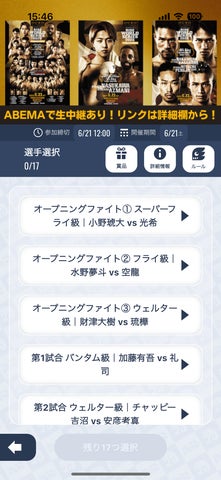 予想企画では、全17試合の勝敗だけでなく、KO・TKO勝ちや判定勝ちなど、勝敗の決まり方まで予想可能。