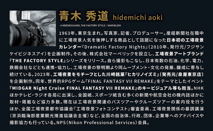 本プロジェクトは、川崎工場夜景の魅力を発信するもので、青木氏の作品と、工場企業の特別協力を得て、秘蔵エピソードなどの特典も付属する。