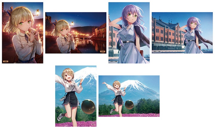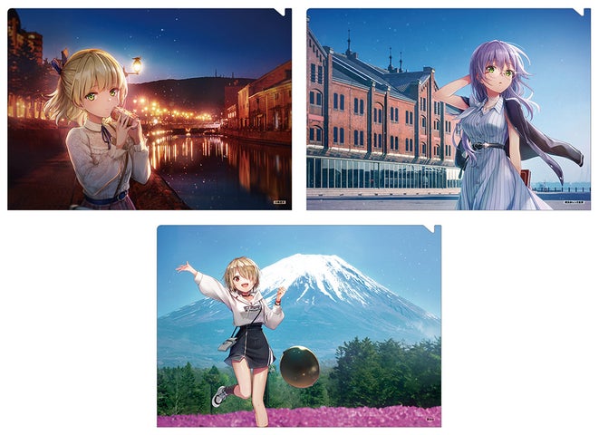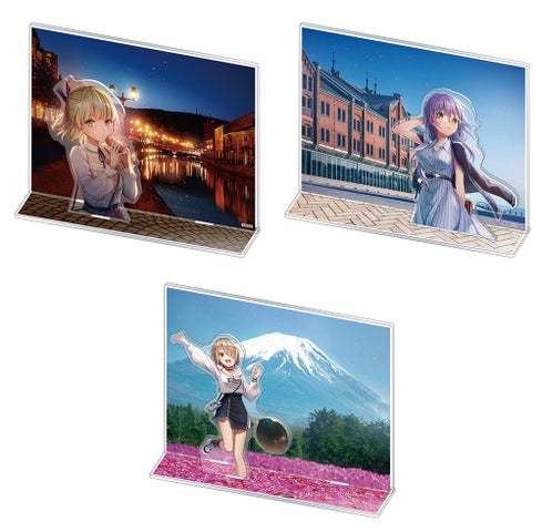 茅森月歌、七瀬七海、和泉ユキたちが各地の名所を訪れる描き下ろしイラストを使用したアクリルジオラマ、SNS風アクリルキーホルダー、クリアファイル、スタイルキーホルダー、編成画面風アクリルジオラマなどが登場。