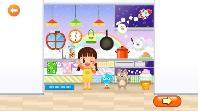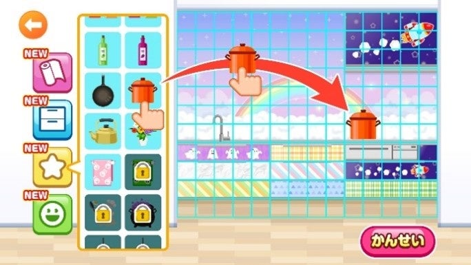 - ゲームは「おしえて!おすすめキッチン」と「キッチンデザイナーごっこ」の2つで構成。