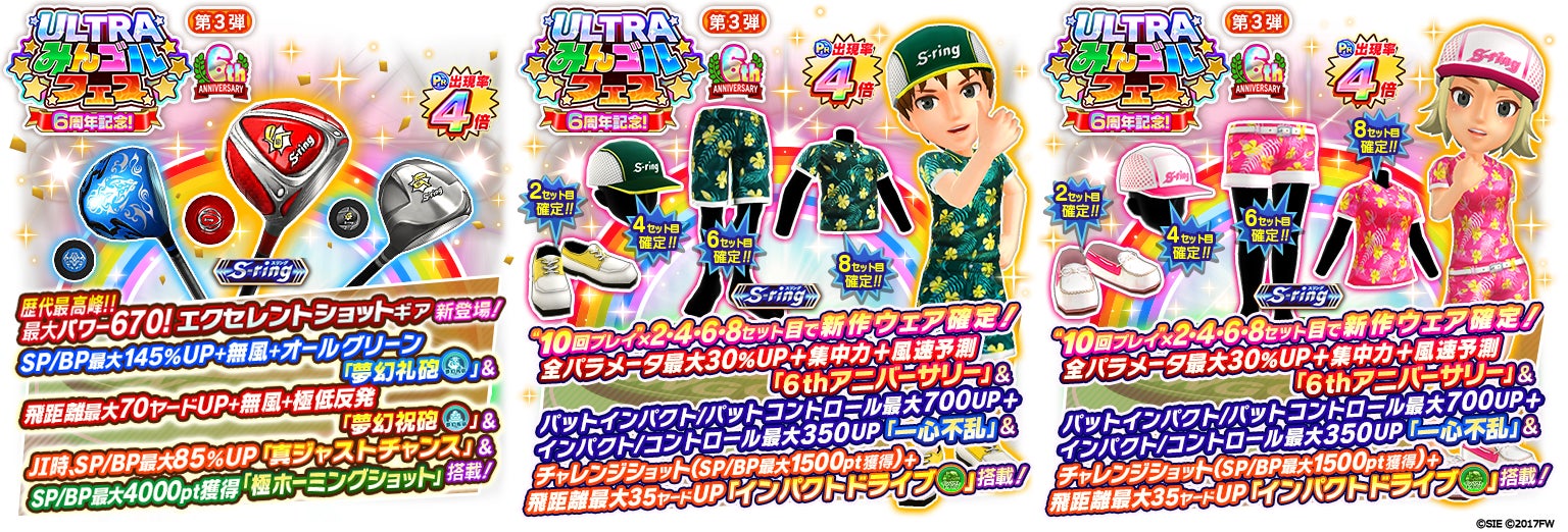 また、6周年記念の「ULTRAみんゴルフェス」では、最大パワー670の「エクセレントショットギア」や新作ウェアが登場します。