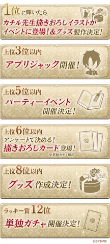 総選挙では、順位に応じた豪華公約として、1位のキャラクターは描きおろしイラストのイベント登場とグッズ製作が決定。
