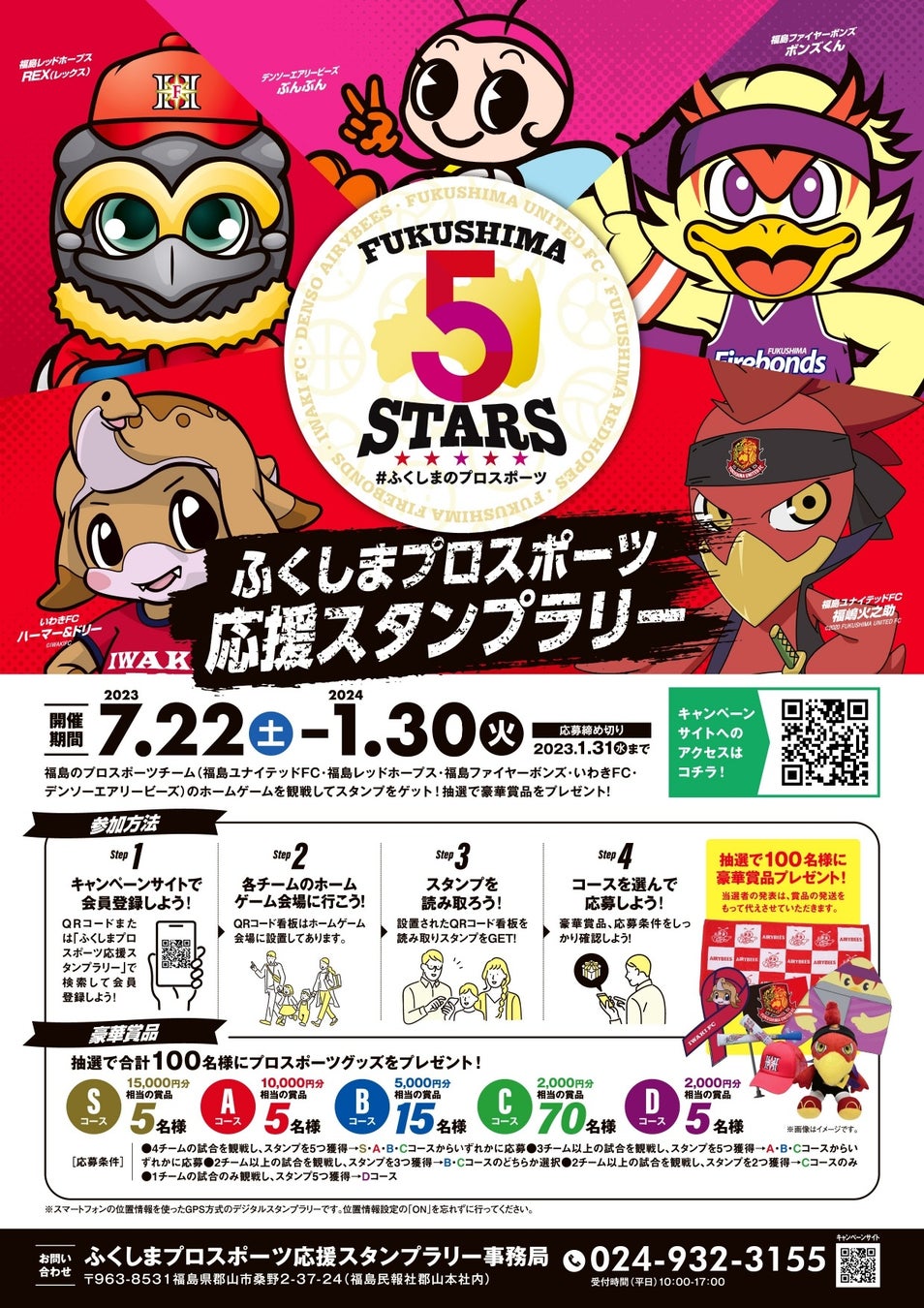 福島県では、福島ユナイテッドFC、いわきFC、福島レッドホプス、福島ファイヤーボンズ、デンソーエアリービーズの5つのプロスポーツチームのホームゲームを対象に、「ふくしまプロスポーツ応援スタンプラリー」が開催されます。
