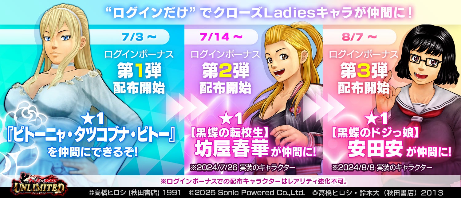 - ログインボーナスで【★1 クローズLadies キャラ】達が仲間に加わるチャンス。