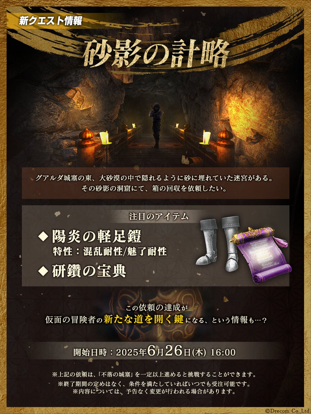 - 『Wizardry Variants Daphne』に新クエスト「砂影の計略」が登場。「砂影の洞窟」を探索し、アイテムを入手。