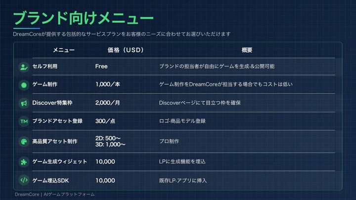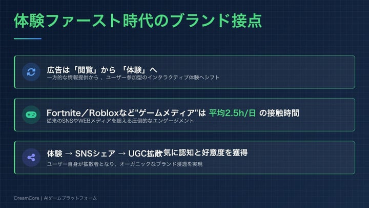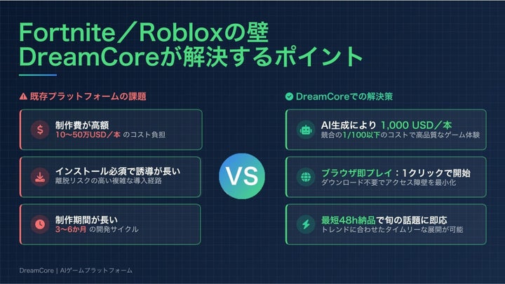 DreamCoreは、テキスト入力だけでゲームを制作・公開できるAIプラットフォームであり、UGCゲーム市場の拡大に対応しています。