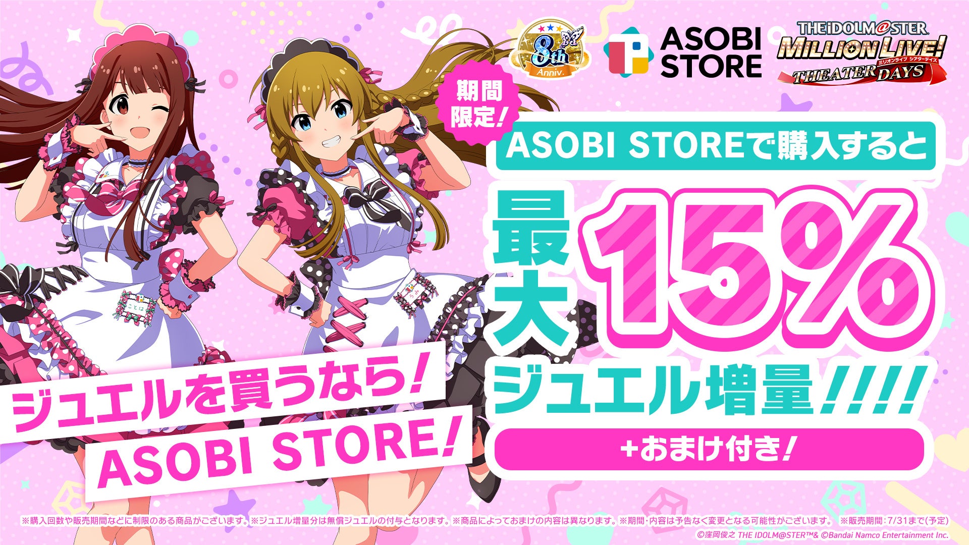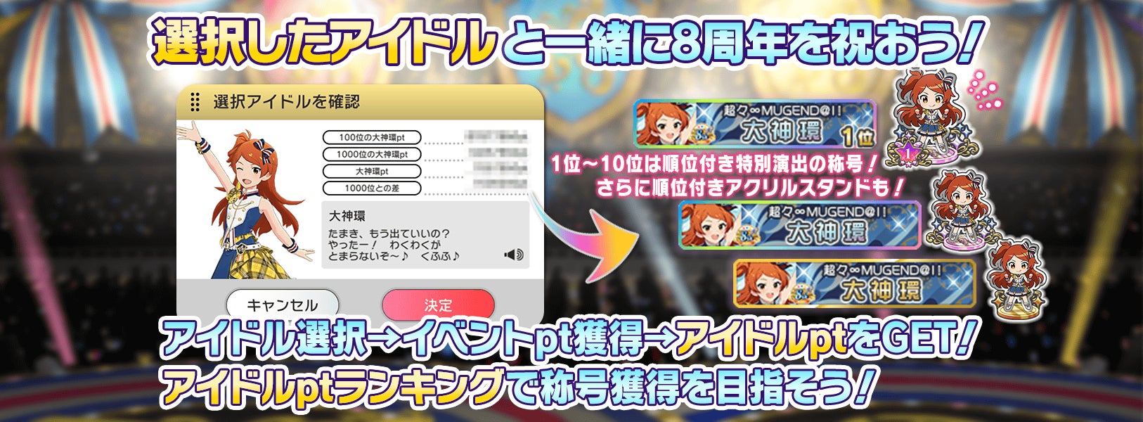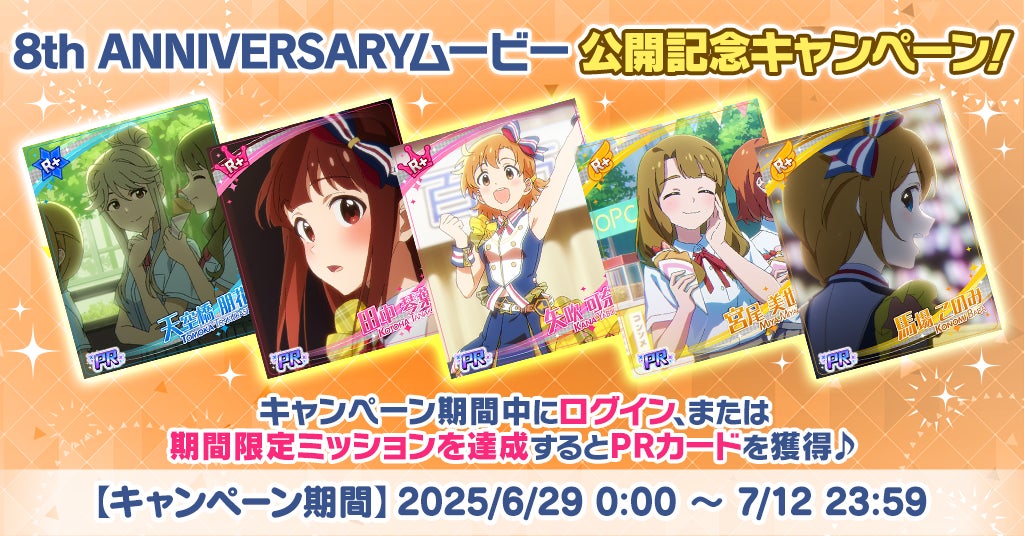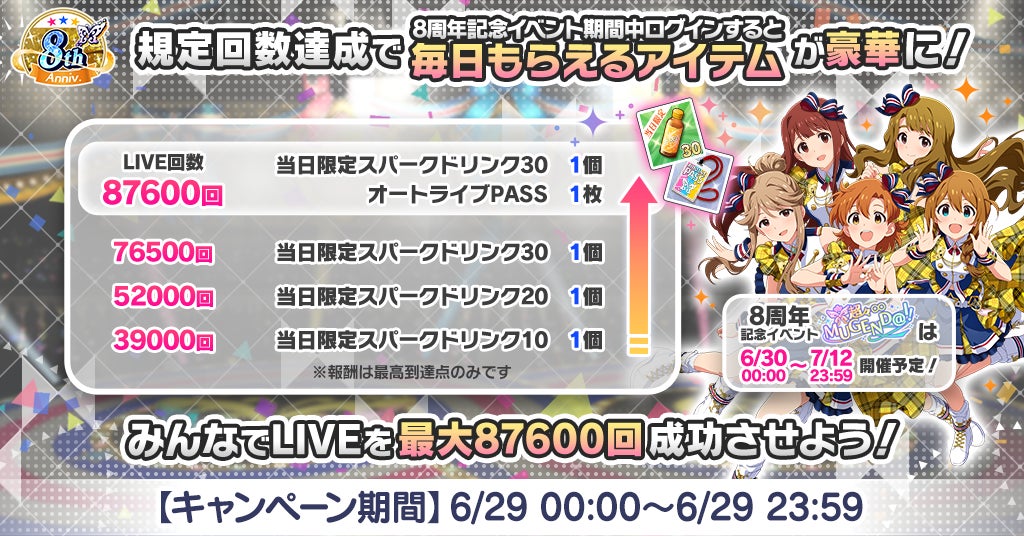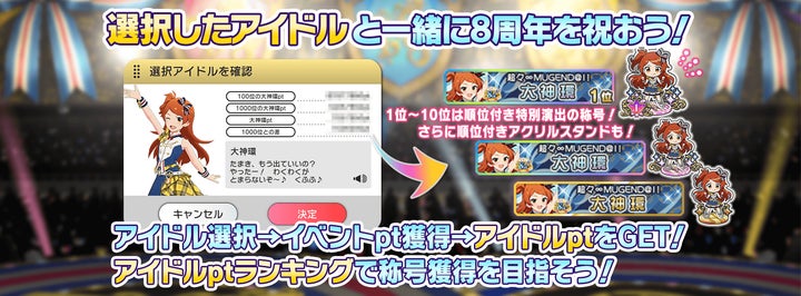 また、PRカード獲得キャンペーンや、期間限定イベント「超々∞MUGEND@I!」の開催、8周年記念プレゼント、39ガシャVOL.2の開催、プロデューサーレベル上限解放など、様々な企画が用意されている。