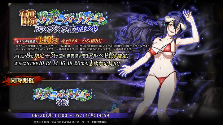 期間は6/30から7/14までで、【水辺の保養探求着】アルベドと【水辺の劫愛探求着】ラナーが新登場します。