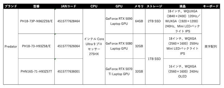 18インチモデルの「PH18-73-H93Z58/E」と「PHN16S-71-H93Z57T/E」は6月30日より、GeForce RTX 5090 Laptop GPUを搭載した「PH18-73P-N962Z59/E」は7月31日発売予定。